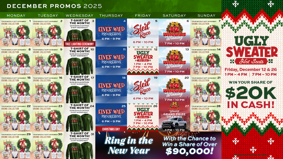 Each Saturday from 7 pm - 10 pm The last winner each Saturday is automatically entered in to the Grand Prize Drawing Finale at 10 pm Grand Prize Drawing will be held on December 27, 2025 from 3 pm - 10 pm Late Night Hot Seats will follow from 10:15 pm - 11:45...