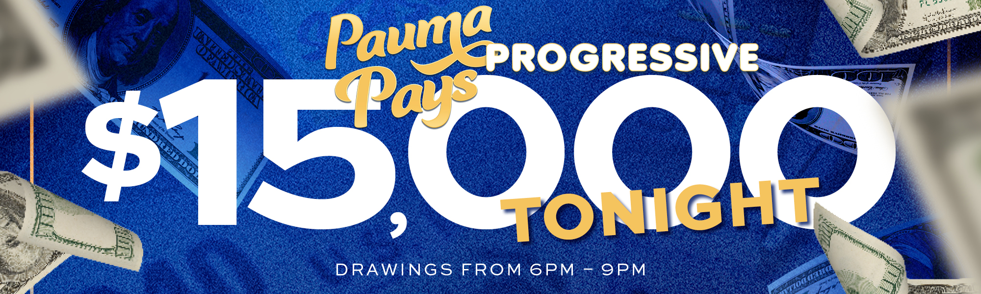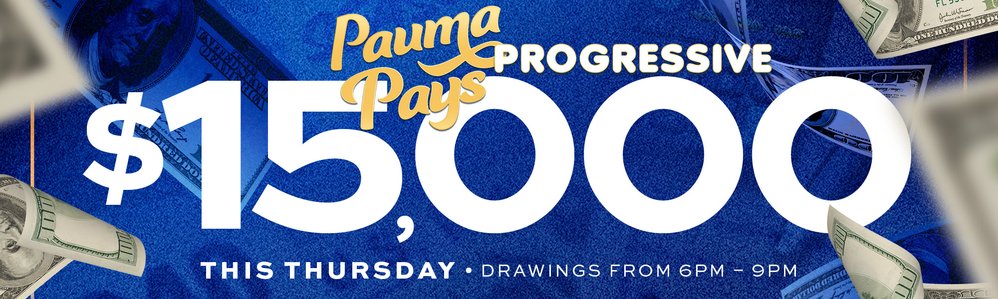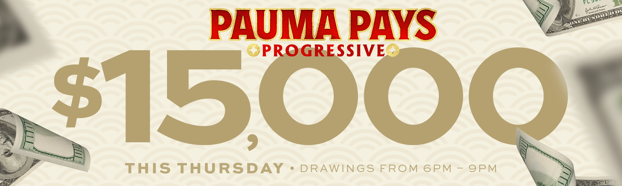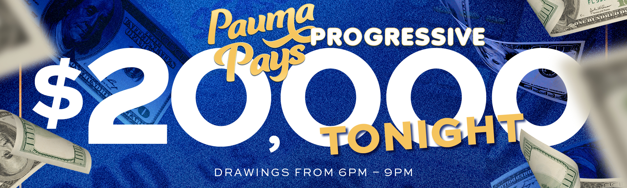 Every Thursday 6:00 PM - 9:00 PM You could win the progressive, $25,000 MUST HIT! Spell Pauma Pays to win the progressive The progressive starts at $5,000 For complete details, please visit the Players Club. Management reserves the right to modify or cancel this...