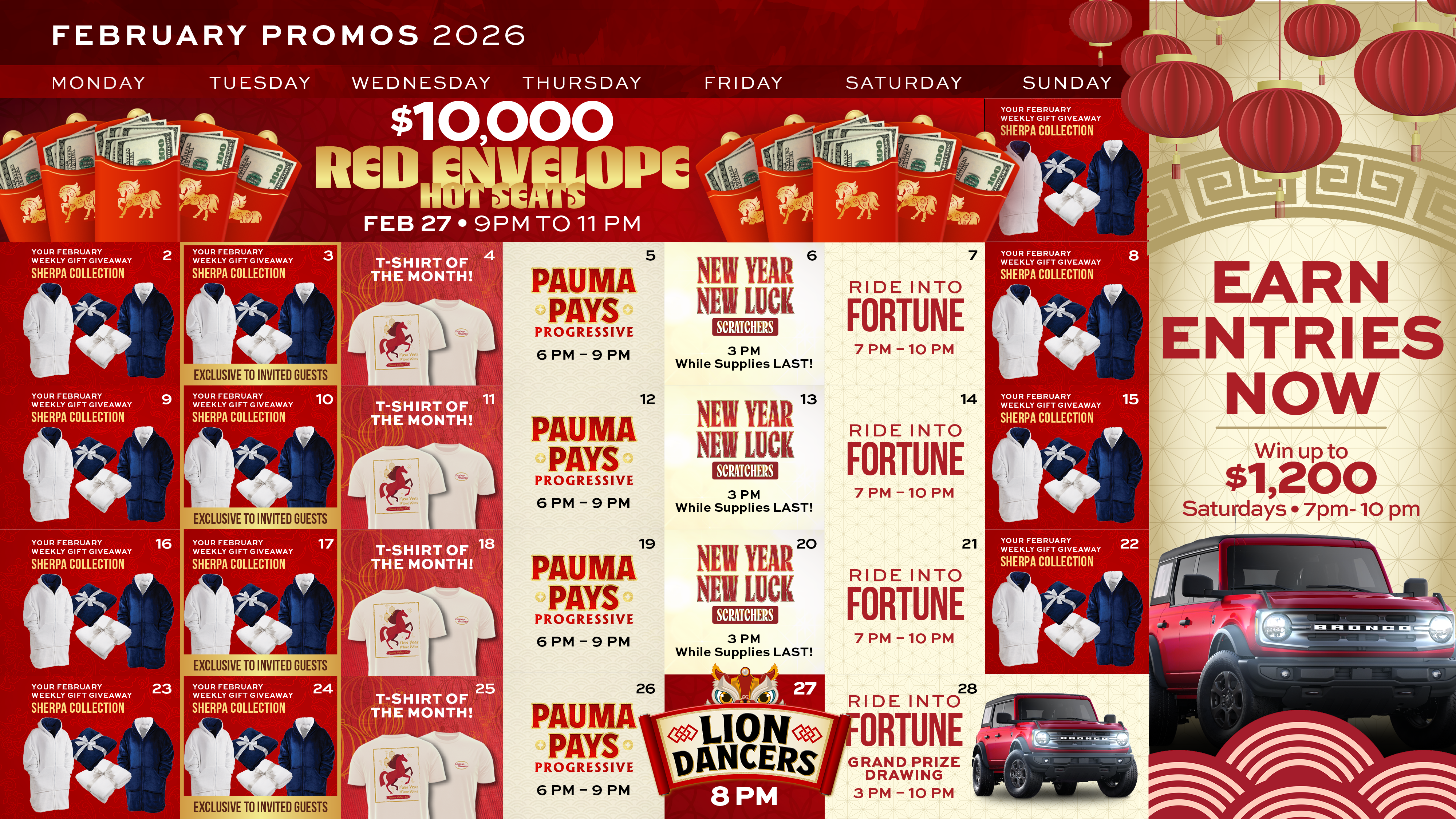 Get ready to WIN big at Casino Pauma’s Red Envelope Hot Seats! A winner every 10 minutes! Drawings run from 9:00 PM to 11:00 PM Our 11:00 PM winner will receive $2,500! Slots only. For complete details, please visit the Players Club. Management reserves the right to...