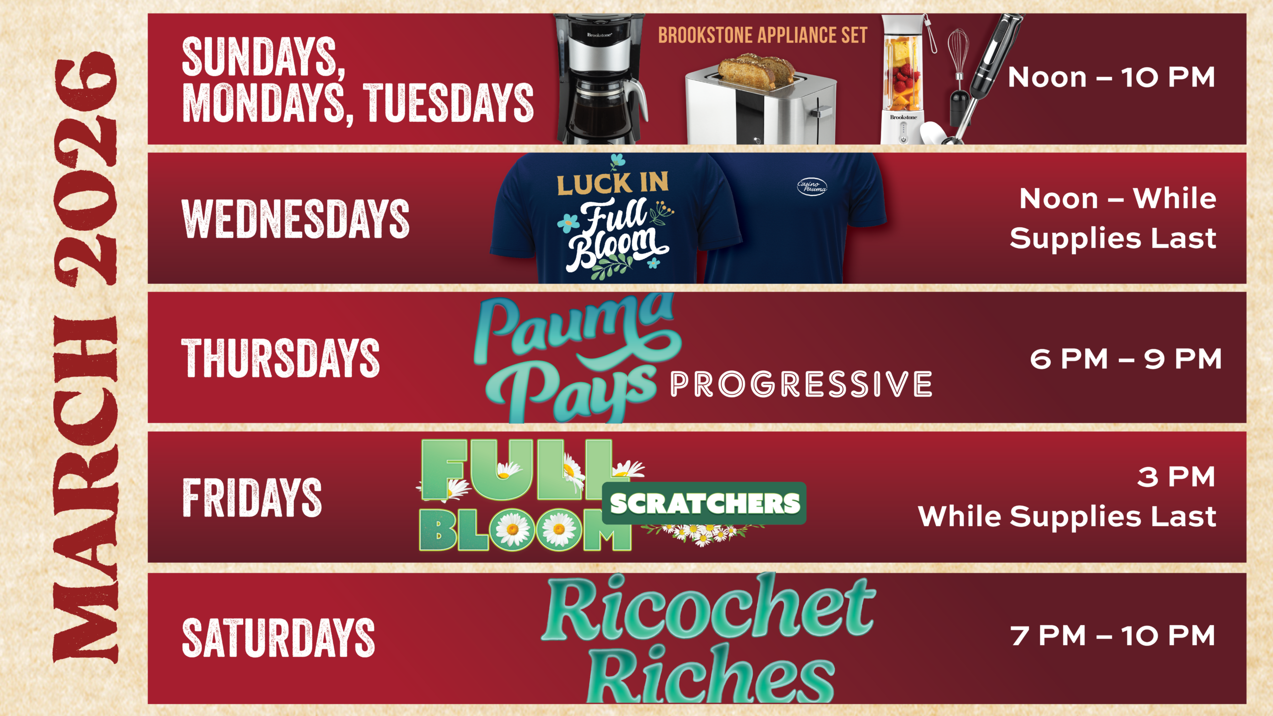 Win up to $1,000 Pauma Play Every Friday Earn 35 base points to receive your scratcher Scratchers are available after 3:00 PM, while supplies last For complete details, please visit the Players Club. Management reserves the right to modify or cancel this promotion.
