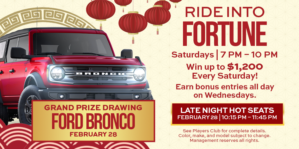 Earn Entries Today! Join us Saturdays Join us each Saturday in February Spin to win up to $1,200 each promotional day Grand Prize Drawings will be held on February 28, 2026 from 3 pm – 10 pm Late Night Hot Seats will follow from 10:15 pm – 11:45 pm...