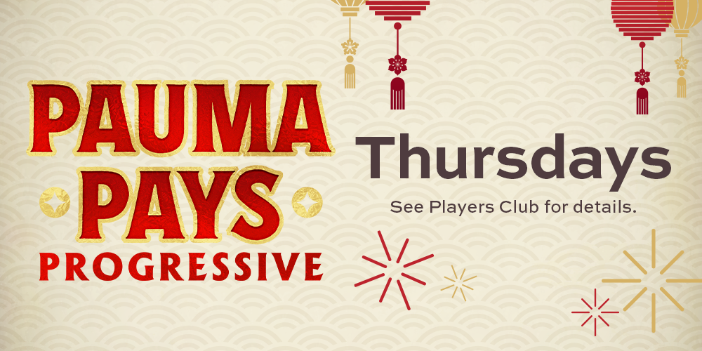 Join Us Thursdays! Every Thursday 6:00 PM – 9:00 PM You could win the progressive, $25,000 MUST HIT! Spell Pauma Pays to win the progressive The progressive starts at $5,000 For complete details, please visit the Players Club. Management reserves the right to...